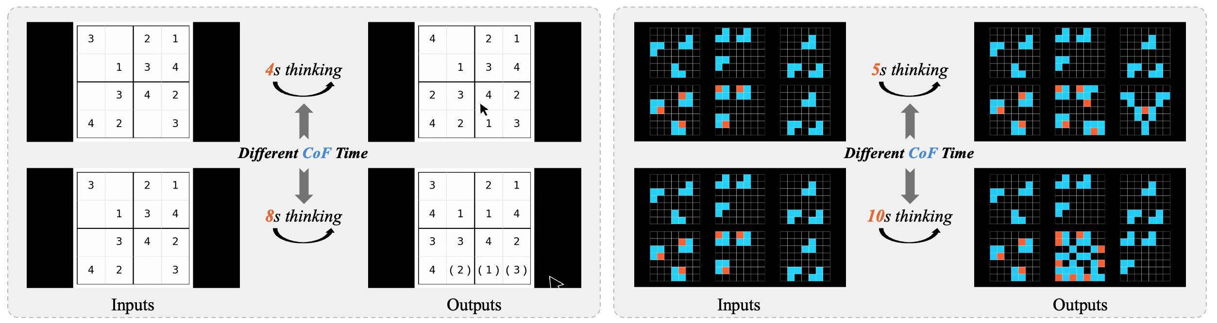 Effect of video duration on reasoning outcomes of Sora2 in the Chain-of-Frame setting. Each row compares model generations with different "thinking" durations for tasks such as Sudoku and Rule Following. Although longer durations correspond to longer reasoning processes (4s vs. 8s, 5s vs. 10s), the resulting outputs do not consistently improve.