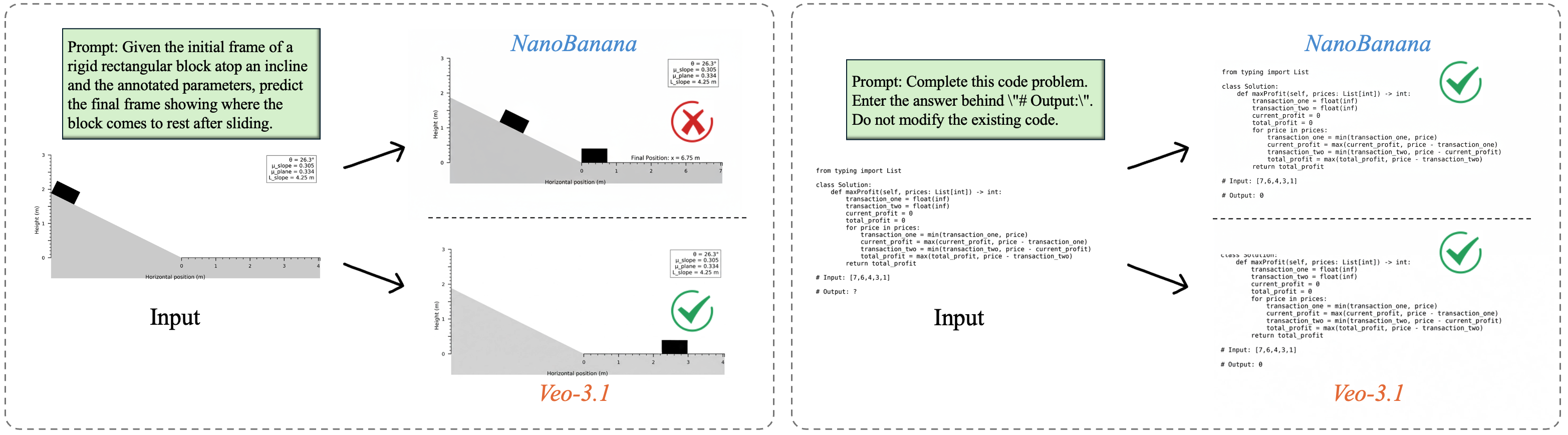 Comparison between Veo-3.1 (video model) and NanoBanana (image model) on Block Sliding (left) and Code Execution (right). Video models leverage the Chain-of-Frames process to simulate intermediate states, enabling stronger performance on tasks that require causal or temporal reasoning, although intermediate transitions may still appear physically inconsistent. Image models provide clean and stable outputs and excel at text-based tasks such as code execution, but their single-frame reasoning limits their ability to capture the underlying physical dynamics.
