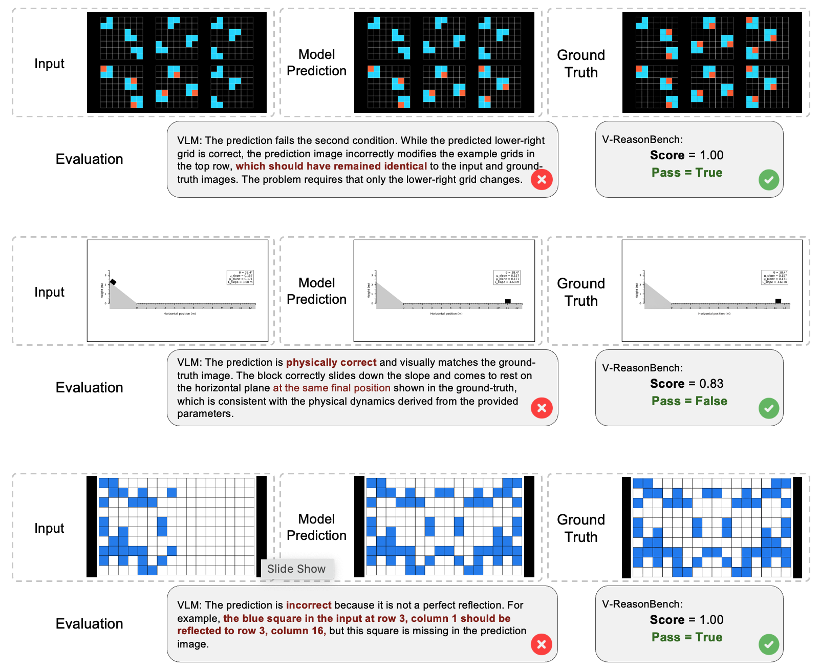 Example failure case from several reasoning tasks illustrating the limitations of VLM-based automatic evaluation. Although the underlying rule is simple, the VLM incorrectly assesses the model's output due to difficulties in recognizing small grid cells and fine structural differences.