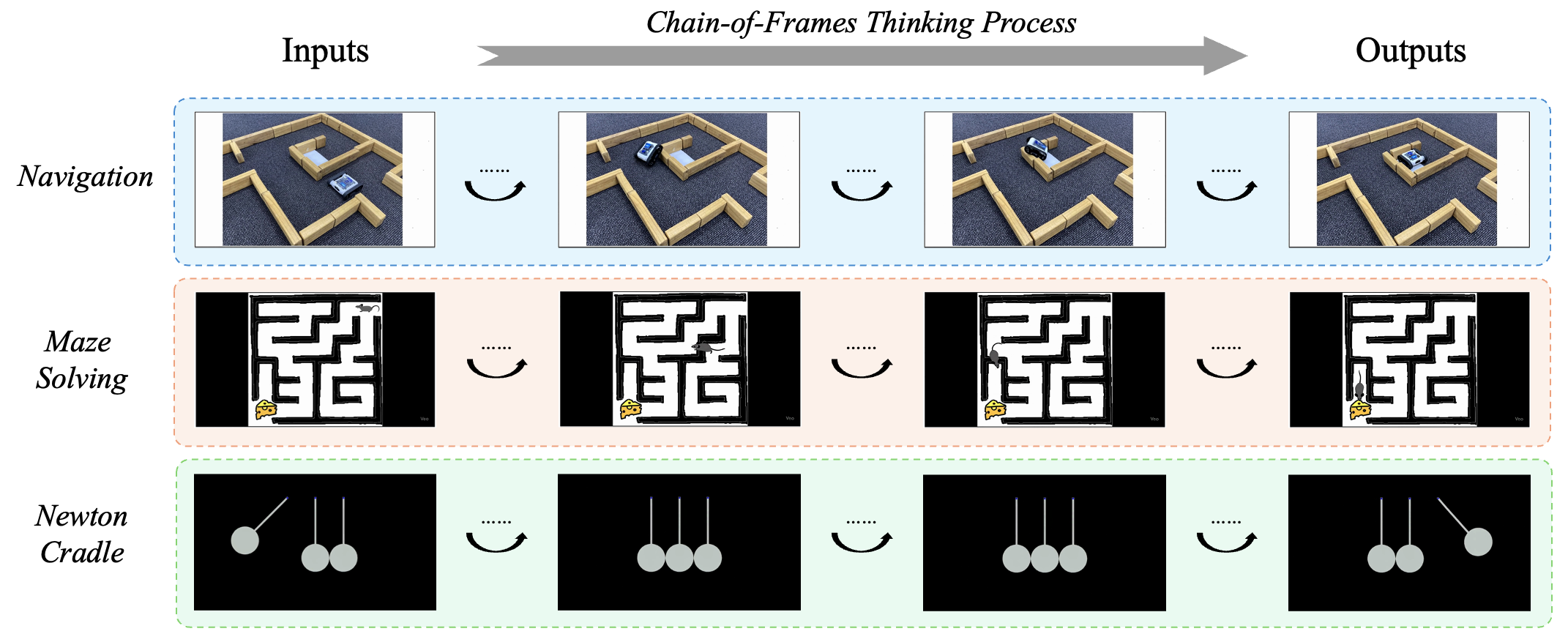 Examples of hallucinations in the Chain-of-Frame reasoning process. Each row shows a trajectory from input to output, where the final frame is correct but intermediate frames display unrealistic or physically inconsistent transitions.