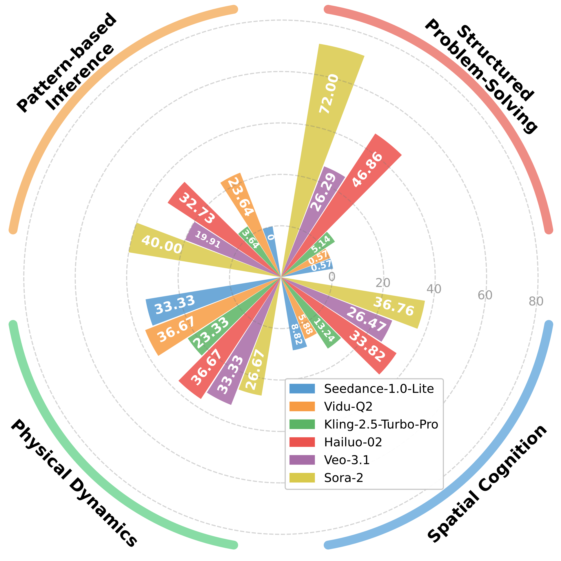 Model-level overall and per-dimension performance on V-ReasonBench. A pass@5 score for each model is calculated within each dimension and presented accordingly (left). Summary of V-ReasonBench performance across video models (right). The figure illustrates how six video generation models perform on 13 reasoning tasks, with scores rescaled within each dimension to enable direct comparison.