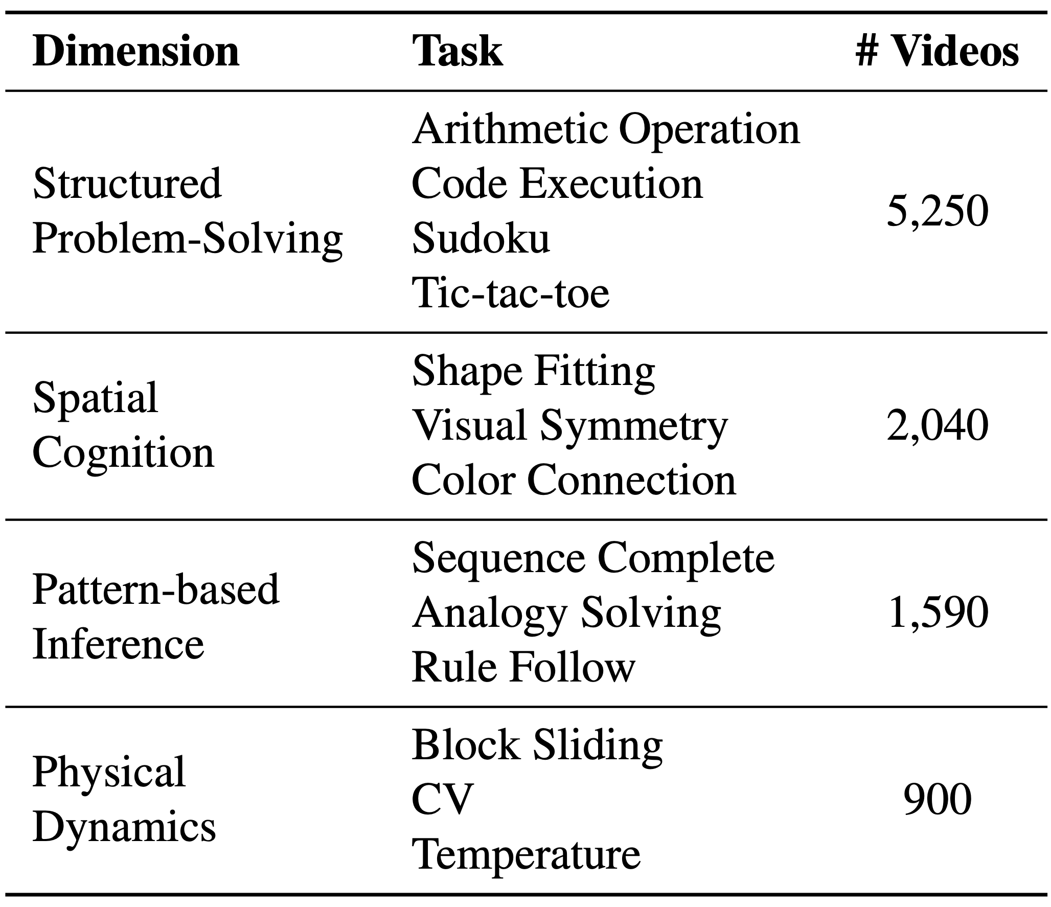 Overview of reasoning dimensions, tasks, and number of videos in V-ReasonBench. Each instance is an initial–final image pair, with each model generating five videos for pass@5 evaluation.